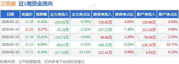 资金流向数据方面,本周卫信康主力资金合计净流出756.33万元,游资资金合计净流出8.66万元,散户资金合计净流入764.99万元。本周资金流向一览见下表: