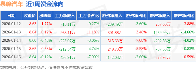资金流向数据方面,本周泉峰汽车主力资金合计净流入77.66万元,游资资金合计净流入685.71万元,散户资金合计净流出763.37万元。本周资金流向一览见下表: