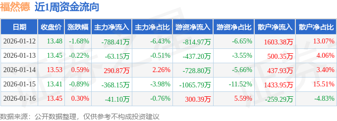 资金流向数据方面,本周福然德主力资金合计净流出969.94万元,游资资金合计净流出2746.37万元,散户资金合计净流入3716.31万元。本周资金流向一览见下表: