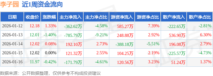 沪深股通持股方面,截止2026年1月16日收盘,李子园沪股通持股数为105.6万股,占流通股比为27.0%。