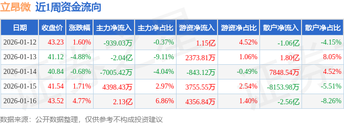 资金流向数据方面,本周立昂微主力资金合计净流出2659.88万元,游资资金合计净流入2.12亿元,散户资金合计净流出1.85亿元。本周资金流向一览见下表: