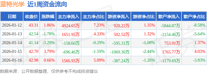 资金流向数据方面,本周蓝特光学主力资金合计净流入7288.46万元,游资资金合计净流出629.11万元,散户资金合计净流出6659.35万元。本周资金流向一览见下表: