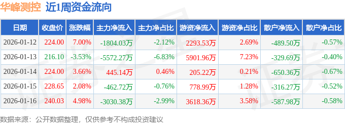 资金流向数据方面,本周华峰测控主力资金合计净流出1.04亿元,游资资金合计净流入1.28亿元,散户资金合计净流出2373.8万元。本周资金流向一览见下表: