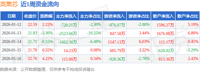 资金流向数据方面,本周英集芯主力资金合计净流出4776.94万元,游资资金合计净流入1196.08万元,散户资金合计净流入3580.86万元。本周资金流向一览见下表: