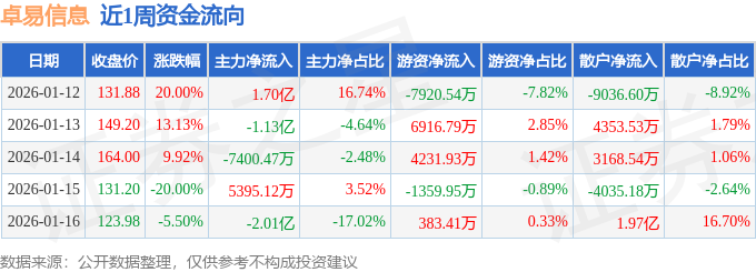 资金流向数据方面,本周卓易信息主力资金合计净流出1.64亿元,游资资金合计净流入2251.64万元,散户资金合计净流入1.41亿元。本周资金流向一览见下表: