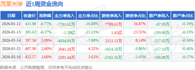 资金流向数据方面,本周茂莱光学主力资金合计净流出2.22亿元,游资资金合计净流入2.31亿元,散户资金合计净流出830.79万元。本周资金流向一览见下表: