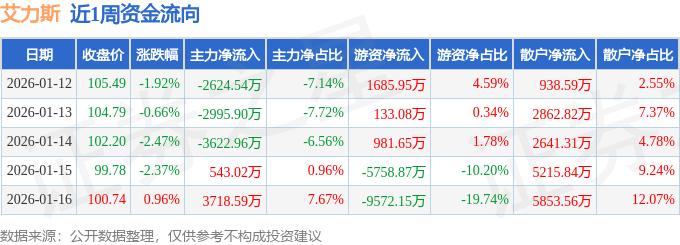 资金流向数据方面,本周艾力斯主力资金合计净流出4981.79万元,游资资金合计净流出1.25亿元,散户资金合计净流入1.75亿元。本周资金流向一览见下表: