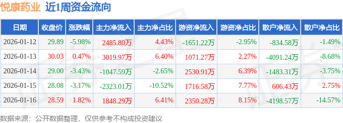 资金流向数据方面,本周悦康药业主力资金合计净流入3983.45万元,游资资金合计净流入6017.82万元,散户资金合计净流出1.0亿元。本周资金流向一览见下表: