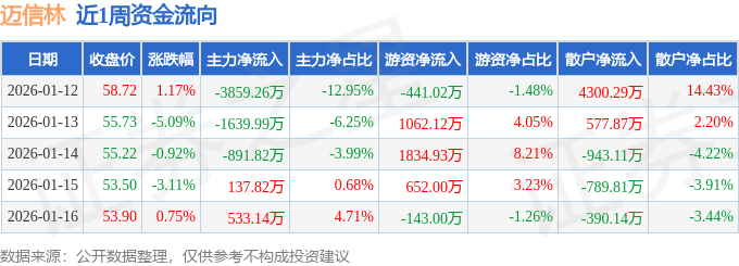 资金流向数据方面,本周迈信林主力资金合计净流出5720.12万元,游资资金合计净流入2965.03万元,散户资金合计净流入2755.09万元。本周资金流向一览见下表: