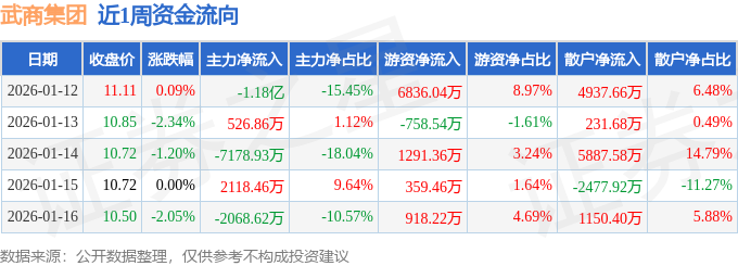 资金流向数据方面,本周武商集团主力资金合计净流出1.84亿元,游资资金合计净流入8646.54万元,散户资金合计净流入9729.39万元。本周资金流向一览见下表: