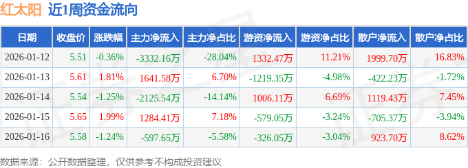 资金流向数据方面,本周红太阳主力资金合计净流出3129.35万元,游资资金合计净流入214.13万元,散户资金合计净流入2915.23万元。本周资金流向一览见下表:
