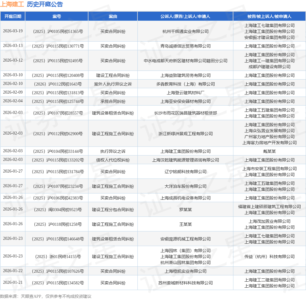 案号:(2025)沪0151民初15982号根据统计,近一年内以上海建工集团股份有限公司为当事人的历史开庭公告有468则,其中案由为“买卖合同纠纷”的公告以129则居首,其次为“建设工程施工合同纠纷”有84则,“案外人执行异议之诉”有50则。历史开庭公告(前20条)如下: