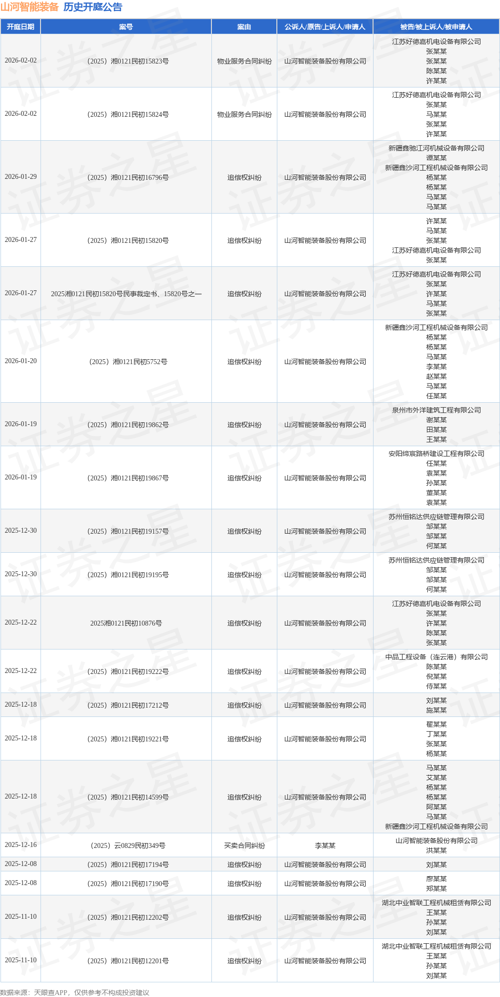 案号:(2025)湘0121民初5752号根据统计,近一年内以山河智能装备股份有限公司为当事人的历史开庭公告有51则,其中案由为“追偿权纠纷”的公告以43则居首,其次为“买卖合同纠纷”有2则,“侵害发明专利权纠纷”有2则。历史开庭公告(前20条)如下:
