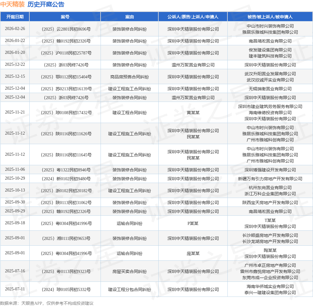 案号:(2025)沪0118民初25787号根据统计,近一年内以深圳中天精装股份有限公司为当事人的历史开庭公告有79则,其中案由为“装饰装修合同纠纷”的公告以51则居首,其次为“建设工程施工合同纠纷”有8则,“建设工程合同纠纷”有4则。历史开庭公告(前20条)如下: