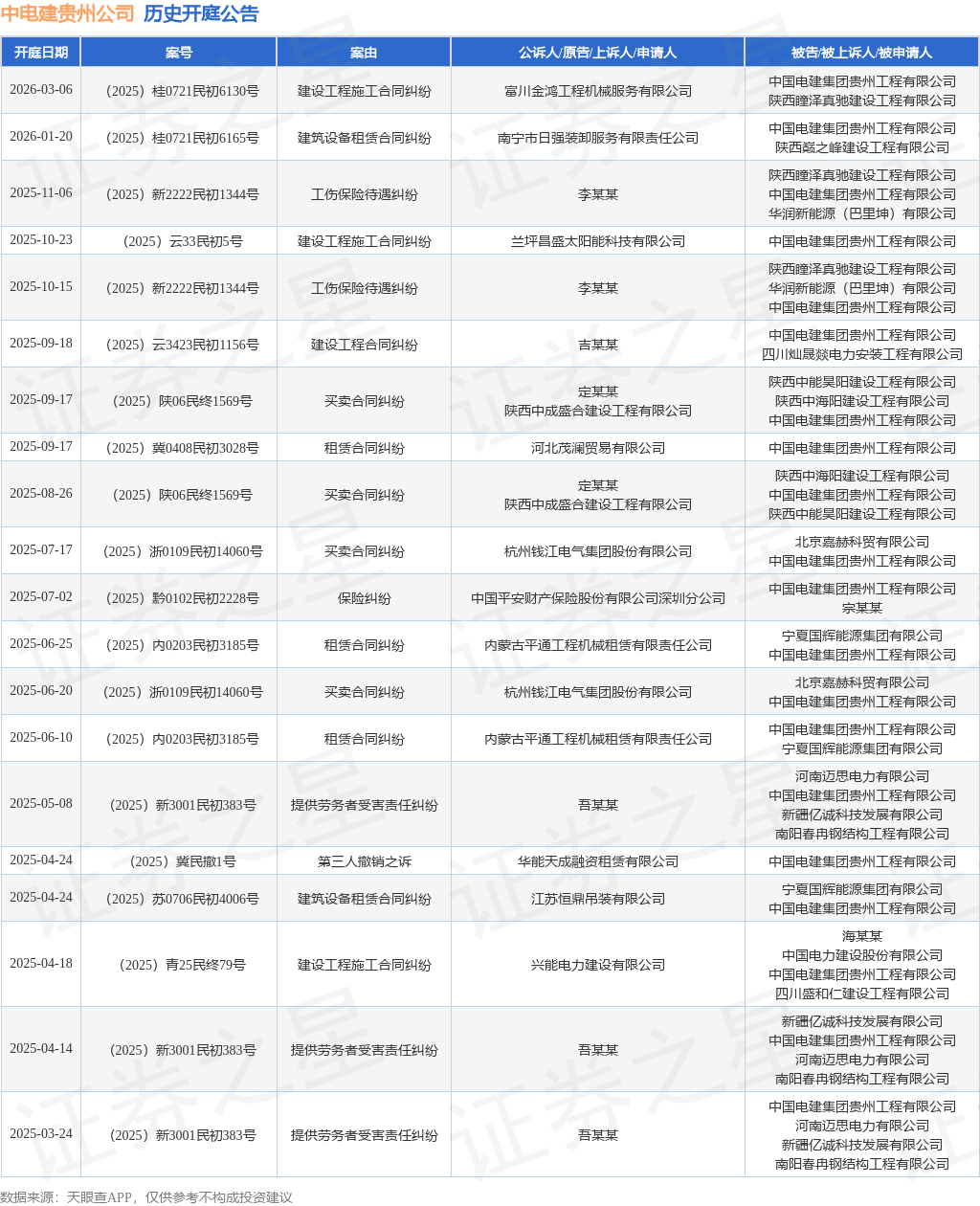 案号:(2025)桂0721民初6165号根据统计,近一年内以中国电建集团贵州工程有限公司为当事人的历史开庭公告有28则,其中案由为“买卖合同纠纷”的公告以4则居首,其次为“合同纠纷”有4则,“建设工程施工合同纠纷”有4则。历史开庭公告(前20条)如下:
