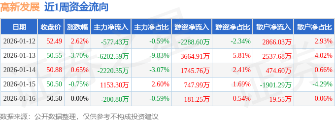 资金流向数据方面,本周高新发展主力资金合计净流出8047.87万元,游资资金合计净流入4051.3万元,散户资金合计净流入3996.57万元。本周资金流向一览见下表: