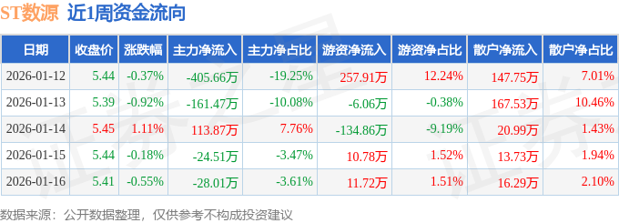 资金流向数据方面,本周ST数源主力资金合计净流出505.79万元,游资资金合计净流入139.49万元,散户资金合计净流入366.29万元。本周资金流向一览见下表: