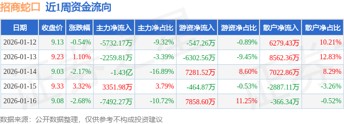 资金流向数据方面,本周招商蛇口主力资金合计净流出2.64亿元,游资资金合计净流入7825.42万元,散户资金合计净流入1.86亿元。本周资金流向一览见下表: