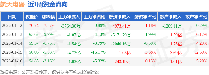 资金流向数据方面,本周航天电器主力资金合计净流出8.75亿元,游资资金合计净流入8482.91万元,散户资金合计净流入7.91亿元。本周资金流向一览见下表: