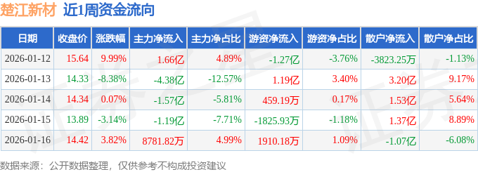 资金流向数据方面,本周楚江新材主力资金合计净流出4.61亿元,游资资金合计净流出339.51万元,散户资金合计净流入4.65亿元。本周资金流向一览见下表: