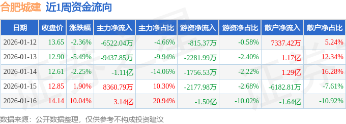 沪深股通持股方面,截止2026年1月16日收盘,合肥城建深股通持股数为410.55万股,占流通股比为51.0%。