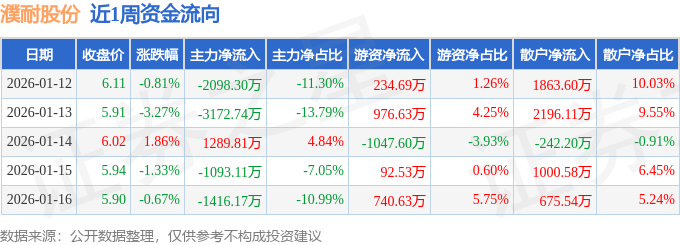 资金流向数据方面,本周濮耐股份主力资金合计净流出6490.51万元,游资资金合计净流入996.88万元,散户资金合计净流入5493.63万元。本周资金流向一览见下表: