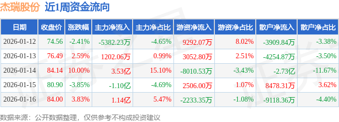 资金流向数据方面,本周杰瑞股份主力资金合计净流入3.15亿元,游资资金合计净流入4606.98万元,散户资金合计净流出3.61亿元。本周资金流向一览见下表: