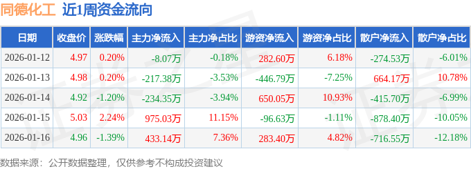 资金流向数据方面,本周同德化工主力资金合计净流入948.38万元,游资资金合计净流入672.63万元,散户资金合计净流出1621.01万元。本周资金流向一览见下表: