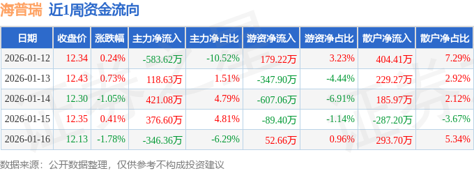 资金流向数据方面,本周海普瑞主力资金合计净流出13.67万元,游资资金合计净流出812.49万元,散户资金合计净流入826.15万元。本周资金流向一览见下表: