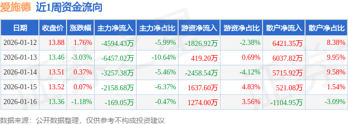 资金流向数据方面,本周爱施德主力资金合计净流出1.66亿元,游资资金合计净流出954.67万元,散户资金合计净流入1.76亿元。本周资金流向一览见下表:
