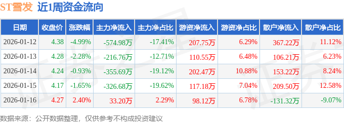 资金流向数据方面,本周ST雪发主力资金合计净流出1440.9万元,游资资金合计净流入736.07万元,散户资金合计净流入704.83万元。本周资金流向一览见下表:
