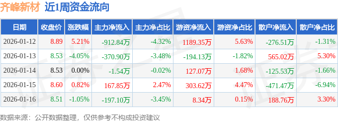 资金流向数据方面,本周齐峰新材主力资金合计净流出1314.53万元,游资资金合计净流入1434.26万元,散户资金合计净流出119.73万元。本周资金流向一览见下表: