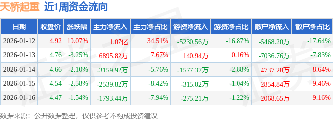 资金流向数据方面,本周天桥起重主力资金合计净流入1.01亿元,游资资金合计净流出7257.22万元,散户资金合计净流出2844.18万元。本周资金流向一览见下表: