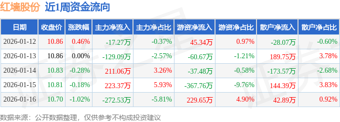 资金流向数据方面,本周红墙股份主力资金合计净流入15.54万元,游资资金合计净流出190.92万元,散户资金合计净流入175.38万元。本周资金流向一览见下表: