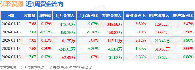 资金流向数据方面,本周优彩资源主力资金合计净流出1016.23万元,游资资金合计净流入525.25万元,散户资金合计净流入490.98万元。本周资金流向一览见下表: