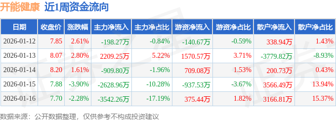 资金流向数据方面,本周开能健康主力资金合计净流出5070.04万元,游资资金合计净流入1576.89万元,散户资金合计净流入3493.15万元。本周资金流向一览见下表: