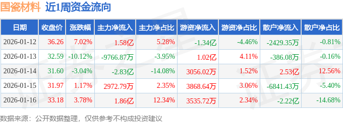 资金流向数据方面,本周国瓷材料主力资金合计净流出655.04万元,游资资金合计净流入7235.6万元,散户资金合计净流出6580.56万元。本周资金流向一览见下表: