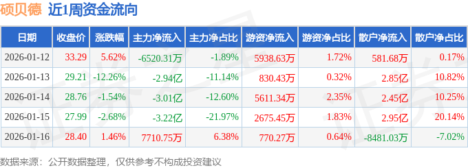资金流向数据方面,本周硕贝德主力资金合计净流出9.05亿元,游资资金合计净流入1.58亿元,散户资金合计净流入7.47亿元。本周资金流向一览见下表:
