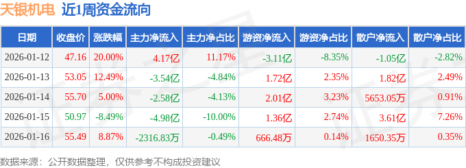 资金流向数据方面,本周天银机电主力资金合计净流出7.16亿元,游资资金合计净流入2.05亿元,散户资金合计净流入5.12亿元。本周资金流向一览见下表:
