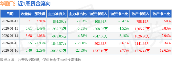 资金流向数据方面,本周华鹏飞主力资金合计净流出7316.22万元,游资资金合计净流入817.01万元,散户资金合计净流入6499.21万元。本周资金流向一览见下表: