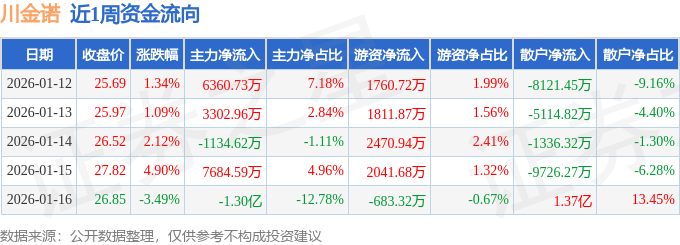 资金流向数据方面,本周川金诺主力资金合计净流入3222.55万元,游资资金合计净流入7401.88万元,散户资金合计净流出1.06亿元。本周资金流向一览见下表: