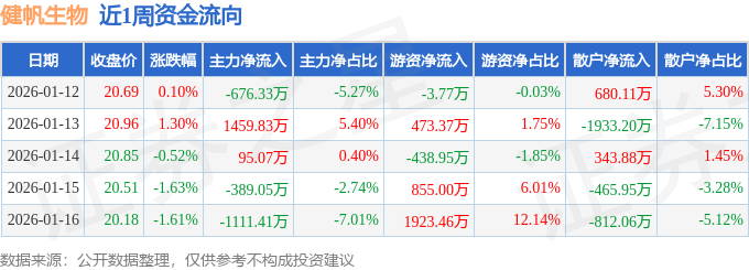 资金流向数据方面,本周健帆生物主力资金合计净流出621.88万元,游资资金合计净流入2809.1万元,散户资金合计净流出2187.22万元。本周资金流向一览见下表: