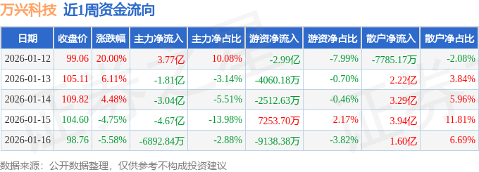 资金流向数据方面,本周万兴科技主力资金合计净流出6.44亿元,游资资金合计净流出3.83亿元,散户资金合计净流入10.28亿元。本周资金流向一览见下表: