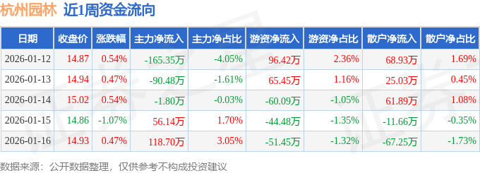 资金流向数据方面,本周杭州园林主力资金合计净流出82.79万元,游资资金合计净流入5.86万元,散户资金合计净流入76.93万元。本周资金流向一览见下表: