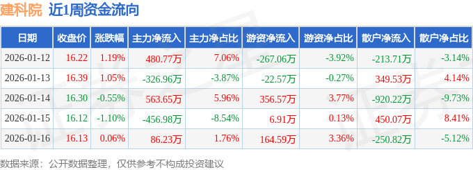 证券之星消息,截至2026年1月16日收盘,建科院(300675)报收于16.13元,较上周的16.03元上涨0.62%。本周,建科院1月14日盘中最高价报16.63元。1月12日盘中最低价报15.94元。建科院当前最新总市值23.66亿元,在工程咨询服务板块市值排名35/41,在两市A股市值排名4982/5183。