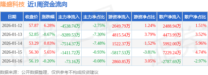 资金流向数据方面,本周隆盛科技主力资金合计净流出2.28亿元,游资资金合计净流入5431.02万元,散户资金合计净流入1.74亿元。本周资金流向一览见下表: