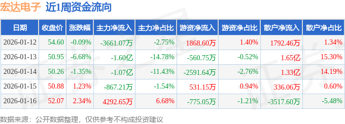 资金流向数据方面,本周宏达电子主力资金合计净流出2.69亿元,游资资金合计净流出1527.68万元,散户资金合计净流入2.85亿元。本周资金流向一览见下表:
