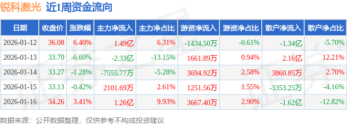资金流向数据方面,本周锐科激光主力资金合计净流出1259.31万元,游资资金合计净流入8841.27万元,散户资金合计净流出7581.96万元。本周资金流向一览见下表:
