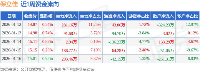 资金流向数据方面,本周保立佳主力资金合计净流入856.01万元,游资资金合计净流出165.73万元,散户资金合计净流出690.28万元。本周资金流向一览见下表: