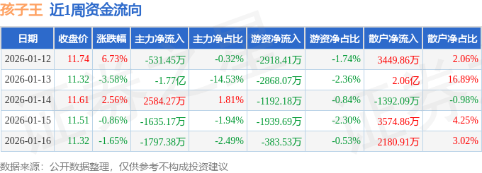 资金流向数据方面,本周孩子王主力资金合计净流出1.91亿元,游资资金合计净流出9301.89万元,散户资金合计净流入2.84亿元。本周资金流向一览见下表: